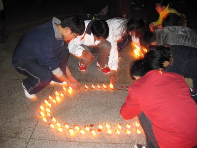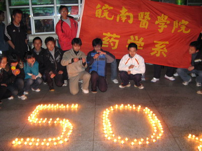 11月27日晚,药学系08级药物制剂专业的同学和辅导员共聚一堂,在食堂二楼举行了“红烛燃情、放歌校庆”烛光晚会,共贺皖医五十年华诞,为学校献上自己的一份美好祝福。